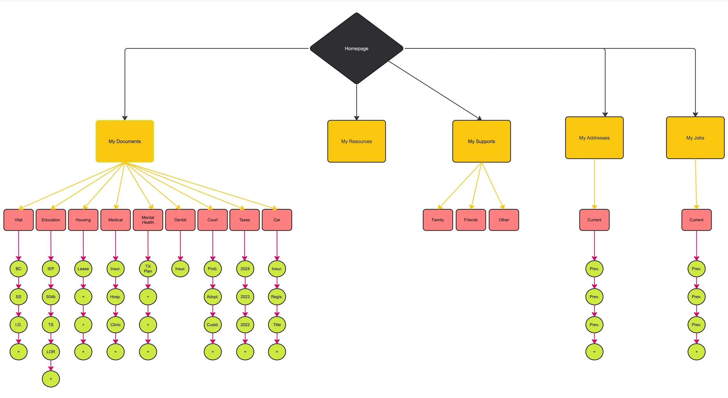 To start this project, I compiled a list of documentation that youth who have been in foster care would typically see at some point along their journey. Truthfully, the list was extensive. I then conducted secondary research to make sure I didn’t miss information the state also required case managers to assist the youth in obtaining. I think the information below is an important visual to see just how much information is passed onto youth as they are nearing 18 or coming out of foster care.