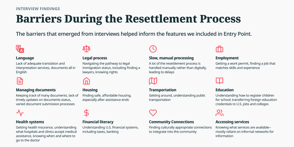 Entry Point eases the resettlement process for immigrants and refugees. The features and design of the app were extracted from existing tools and findings from research, primarily addressing main pain points noted during the resettlement process, such as integrating into a new place with minimal to no experience or knowledge of what to expect. We designed key features in the app to help address these pain points and support immigrants and refugees in their resettlement journey.