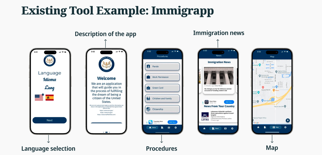 To start this project, it was necessary to gain a better understanding of the steps involved in the resettlement process and research existing apps to understand key functions/features they provided. Noted features (depicted in the pictures below) from existing apps included: the ability to select from different languages; news forums related to immigration; and guides and lessons to learn about resettling in the United States. Features from some of the existing apps later informed some of the design features in our app.