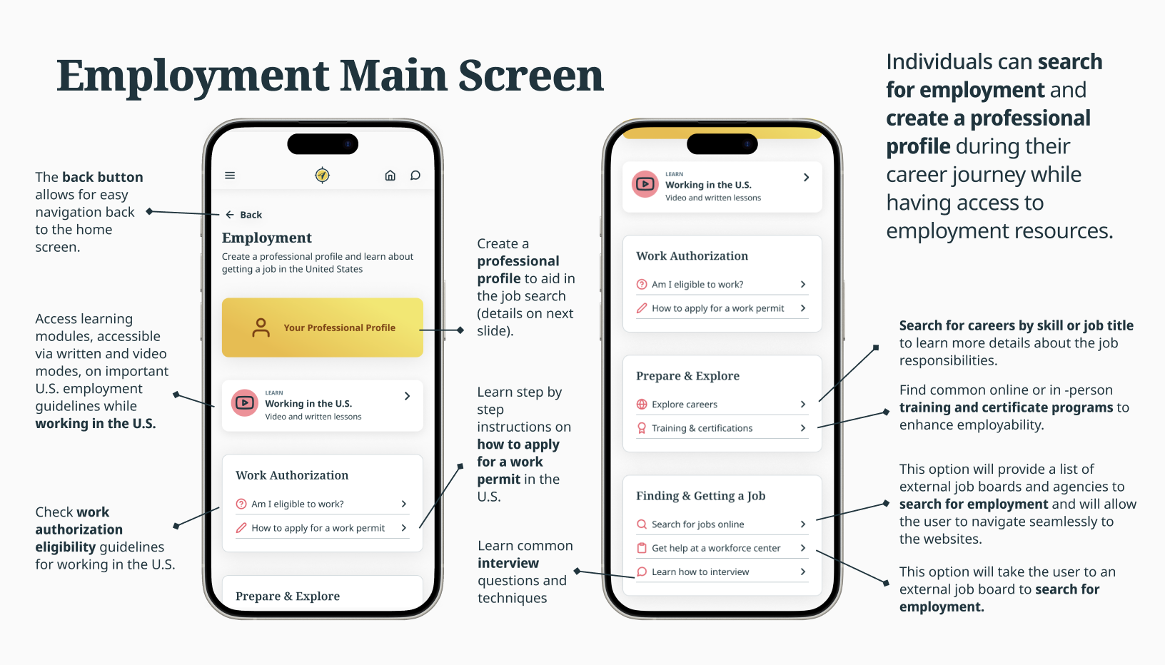When thinking about the features and pages of the app, we wanted to visualize how it would flow that would make the most sense when envisioning how someone would use it, so we started mapping out the connections and then mapped it out in an IA diagram. The hierarchy of information (e.g., information about cultural integration or employment) was based on user feedback about importance of the information and wanting to see certain resources right away (i.e., English classes) on the app.