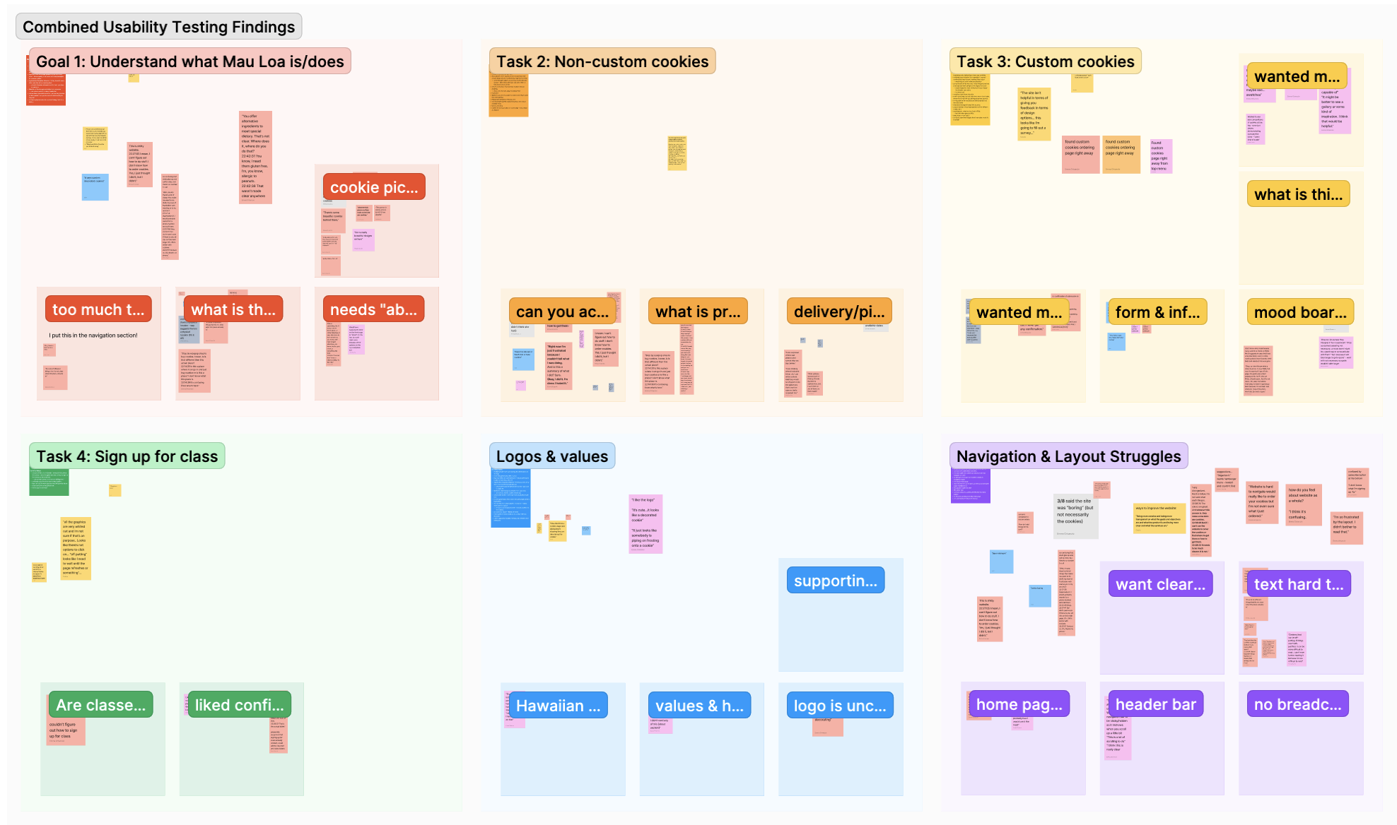 Data from the usability tests were combined in a group repository and later clustered utilizing an affinity diagram. Clusters were defined by task/scenario and noted relevant pain points, common issues/problems and important quotes reported by the users.