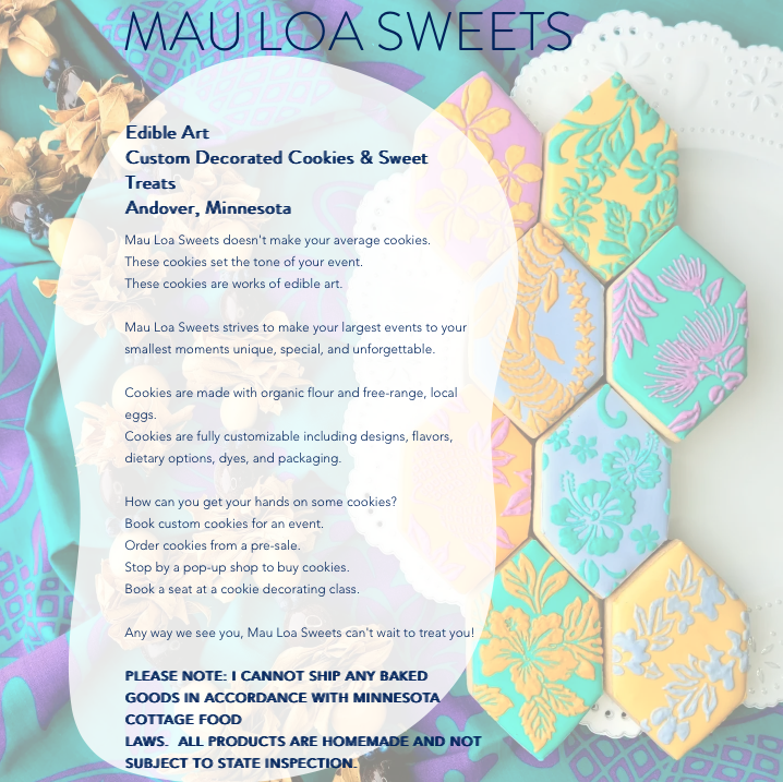 Mau Loa Sweets is a small cookie business located in Andover, MN. Owner and entrepreneur, Kristin, started the business out of her home in 2019 with goals in mind to: offer tasty treats for events; source responsible ingredients; and offer dietary options for those with food restrictions.