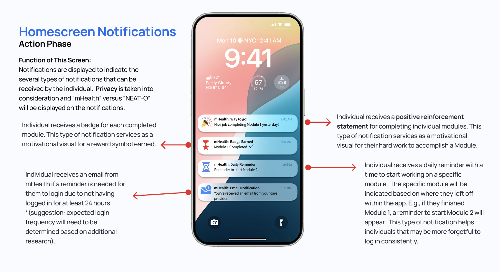 When designing the home screen notifications, I first wanted to ensure that privacy was taken into account. To address this, I decided the general app name that would be displayed on the home screen when someone receives a notification would be ‘mHealth.’ There wouldn’t be any words or phrases that would indicate mental health or substance use. Second, I wanted to focus on motivational notifications as positive reinforcements to indicate a benchmark that was completed. Different badges sent via notification would indicate the completion of a module, and a motivational phrase or statement would be sent as individuals progress through the program (e.g., “Nice job completing module 1 yesterday!”). Along the same line of providing positive reinforcement statements/symbols, I decided it would be helpful to have a notification reminder of when someone wants to start a module for the day. Essentially the thought is that we all are all busy with daily activities, and reminders serve as a way to keep us on track with the goals we set for ourselves.