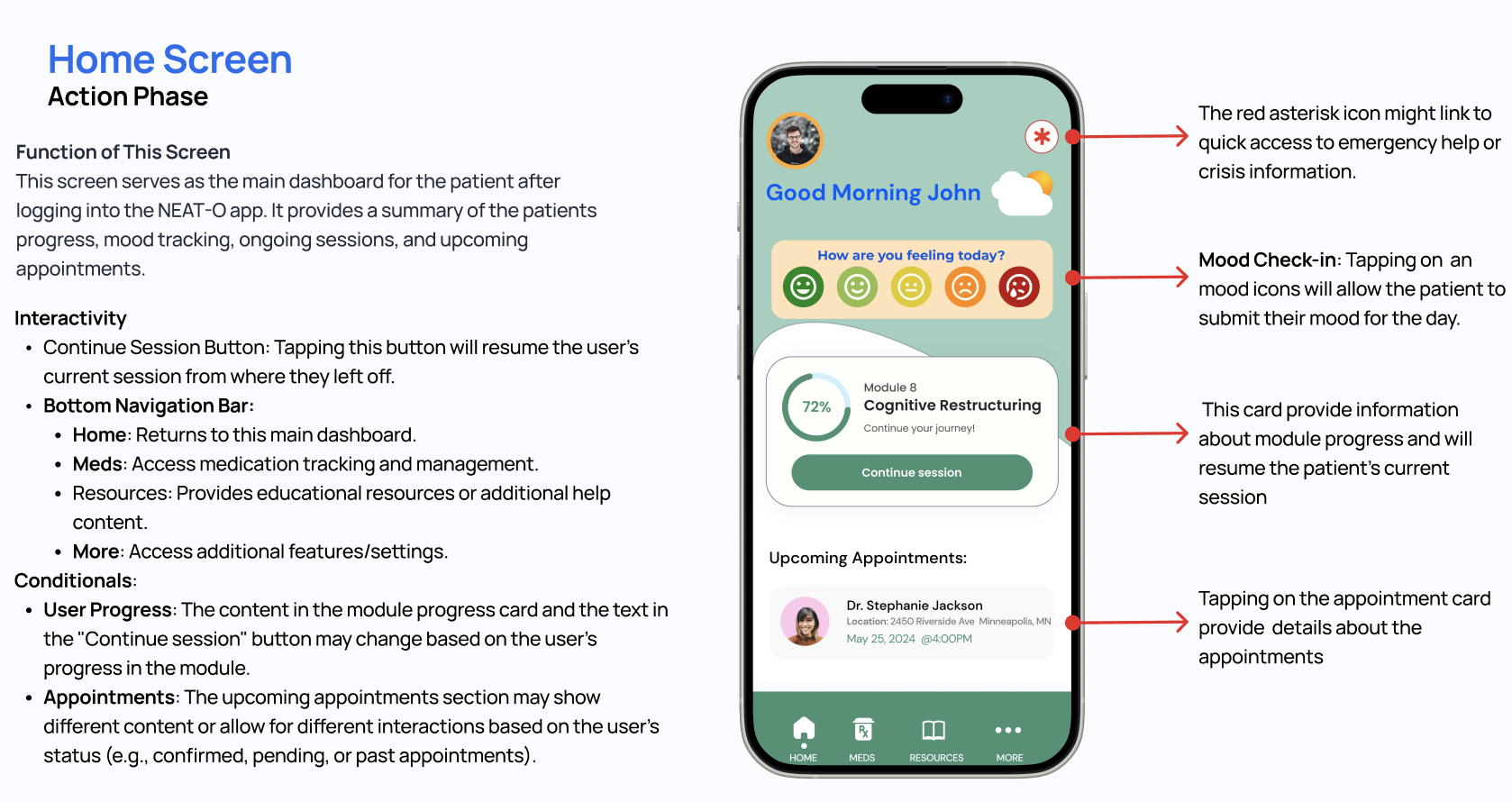 All user experience touchpoints for NEAT-O will help individuals with opioid use disorder and co-occurring anxiety or mood disorders to feel supported and empowered so they are able to effectively manage their recovery journey and improve their quality of life. We will do this by focusing on personalized therapeutic experiences and comprehensive progress tracking.