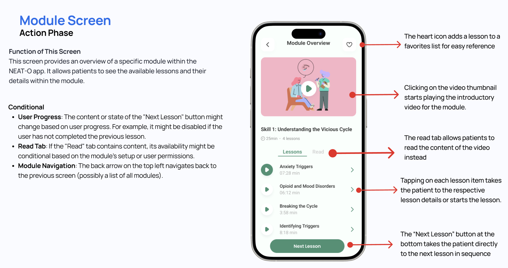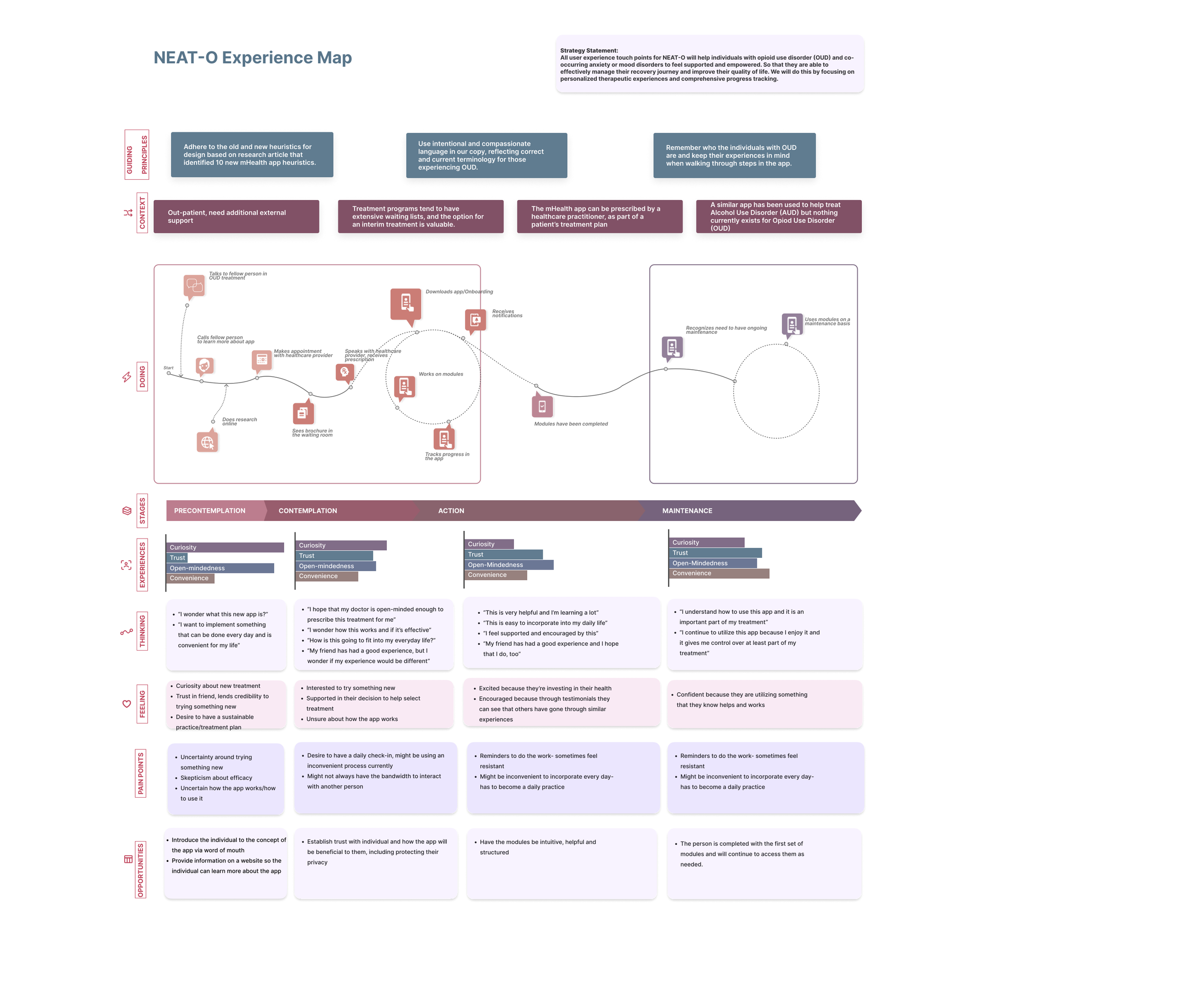 NEAT-O is a digital Cognitive Behavioral Therapy (CBT) program tailored for individuals with opioid use disorder (OUD) and concurrent anxiety or mood disorders. To help visualize this app coming to life, we ideated a series of experiences (from the time a person first heard about the app to completion of the modules), and touch points were mapped out based on how we viewed an individual going through the content in the app. To go a step further, specific touch points were honed in on and made into annotated prototypes to provide a visual to the stakeholders including: a person receiving notifications from the app and what the notifications might be, how progress is monitored and seen, what the module screen might look like (option to listen to content or read content to improve accessibility), and what the home screen could look like. All of the prototypes were guided by the principles we outlined at the start of this project.
