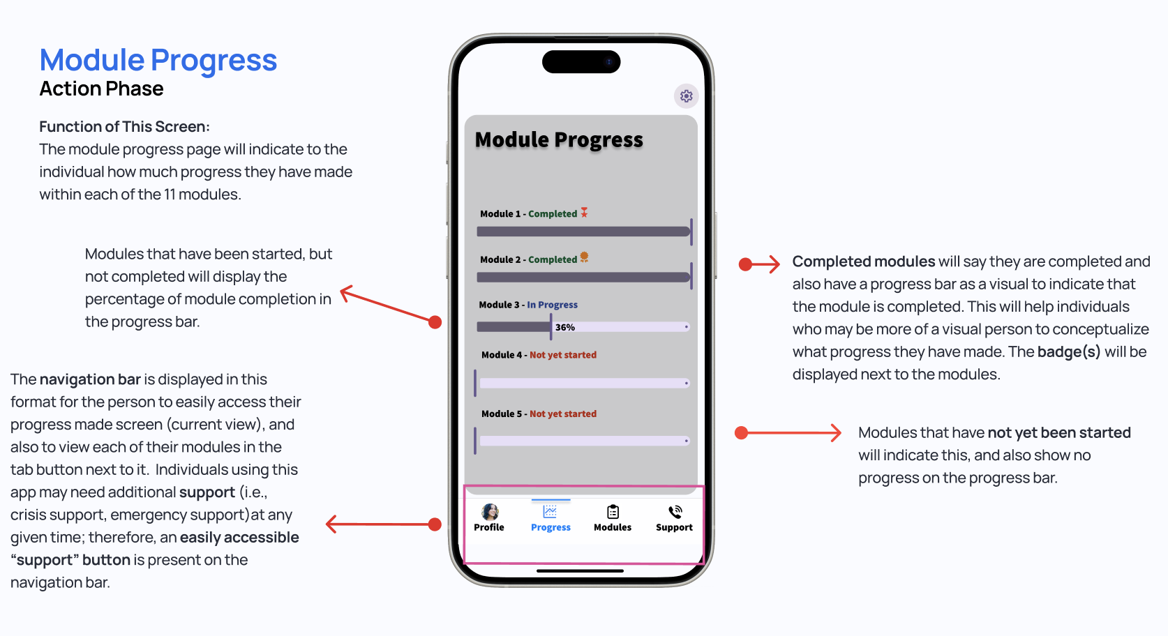 To help visualize this app coming to life, we ideated a series of experiences (from the time a person first heard about the app to completion of the modules), and touch points were mapped out based on how we viewed an individual going through the content in the app. To go a step further, specific touch points were honed in on and made into annotated prototypes to provide a visual to the stakeholders including: a person receiving notifications from the app and what the notifications might be, how progress is monitored and seen, what the module screen might look like (option to listen to content or read content to improve accessibility), and what the home screen could look like.